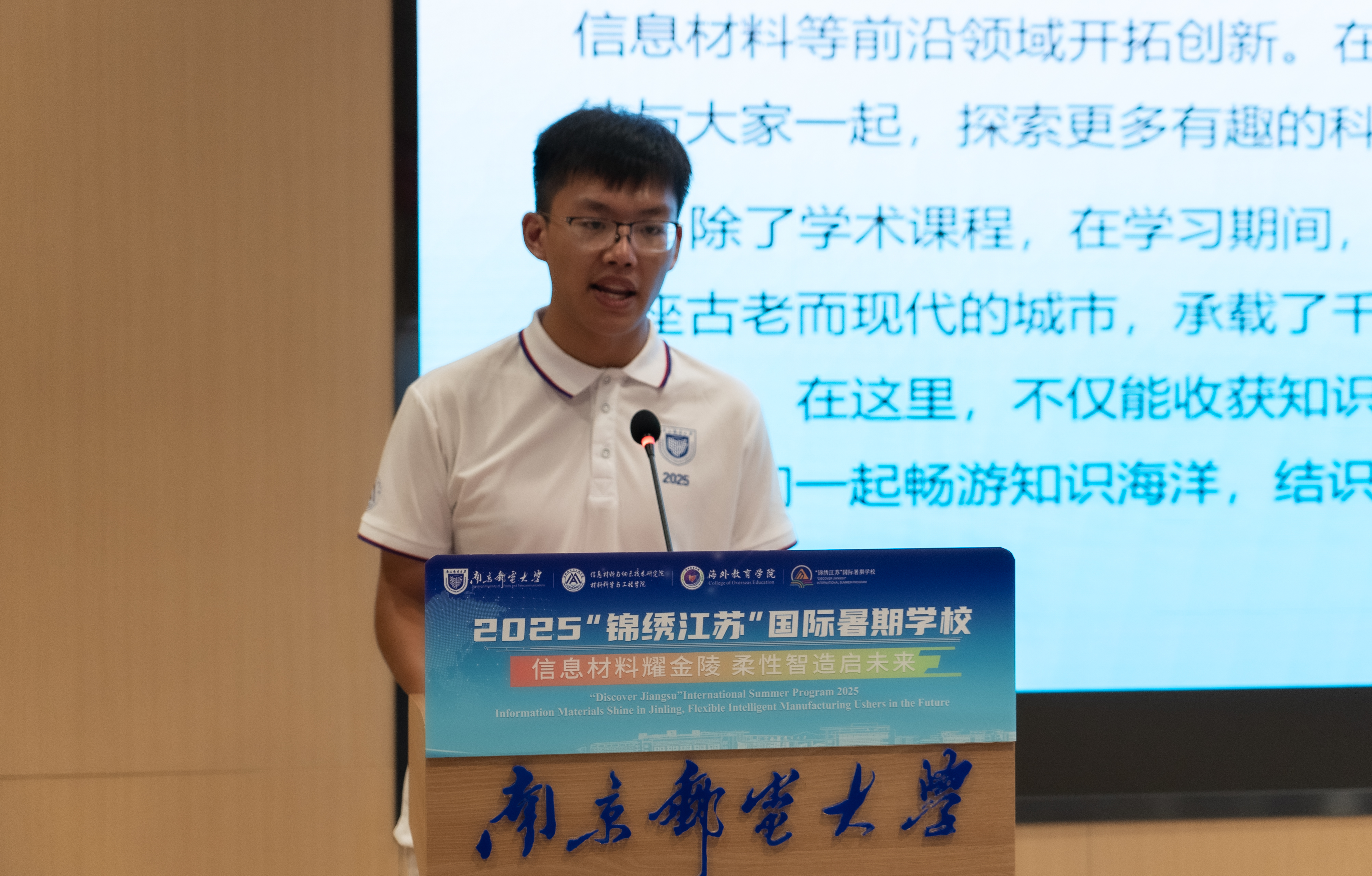 南邮麻豆传媒 周千瑞作为中国学员代表发言。他诚挚邀请中外学员一同深入探索南京,领略其历史底蕴与文化魅力,并在信息材料与柔性电子领域学术交流中汲取学科前沿知识,携手合作、共同进步,通过交流搭建友谊桥梁,促进国际理解与共赢。