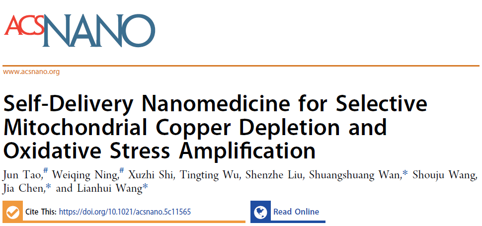近日,麻豆传媒 柔性电子全国重点实验室汪联辉教授团队在自递送纳米药物领域取得新进展。相关成果以“Self-Delivery Nanomedicine for Selective Mitochondrial Copper Depletion and Oxidative Stress Amplification为题发表在国际学术期刊Acs Nano上。重点实验室汪联辉教授、万双双副教授及山东第一医科大学陈嘉副教授为共同通讯作者,青年教师陶俊和硕士生宁维青为论文共同第一作者。