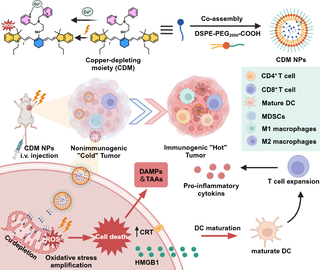 针对上述问题,该团队开发了一种选择性耗竭线粒体铜离子的有机小分子CDM,将其与DSPE-PEG2000-COOH协同组装制备得到自递送纳米药物(CDM NPs)。CDM NPs可快速汇集在肿瘤组织内、精准靶向细胞线粒体、耗竭线粒体铜离子,高效诱导线粒体功能障碍;激光照射后,产生大量的ROS,放大细胞氧化应激,并通过免疫原性细胞死亡有效抑制肿瘤生长,逆转免疫抑制微环境。