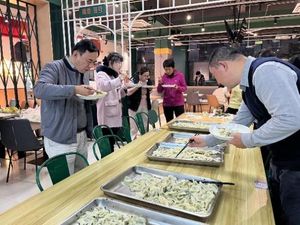 活动现场布置得温馨而热闹,食堂工作人员早已提前备好新鲜的饺子皮、饱满的馅料(猪肉白菜、韭菜鸡蛋、香菇虾仁等多种口味满足不同需求)、筷子、勺子、托盘等物资,整齐摆放的桌椅,大家摩拳擦掌,跃跃欲试。随着分工会负责人宣布活动开始,老师们迅速分成若干小组,围坐一团,包馅、捏、折、扭、卷,动作行云流水,元宝饺、月牙饺、柳叶饺等形态各异的饺子在指尖绽放;还有的忙着摆放饺子、烧水准备下锅,现场分工明确又其乐融融。